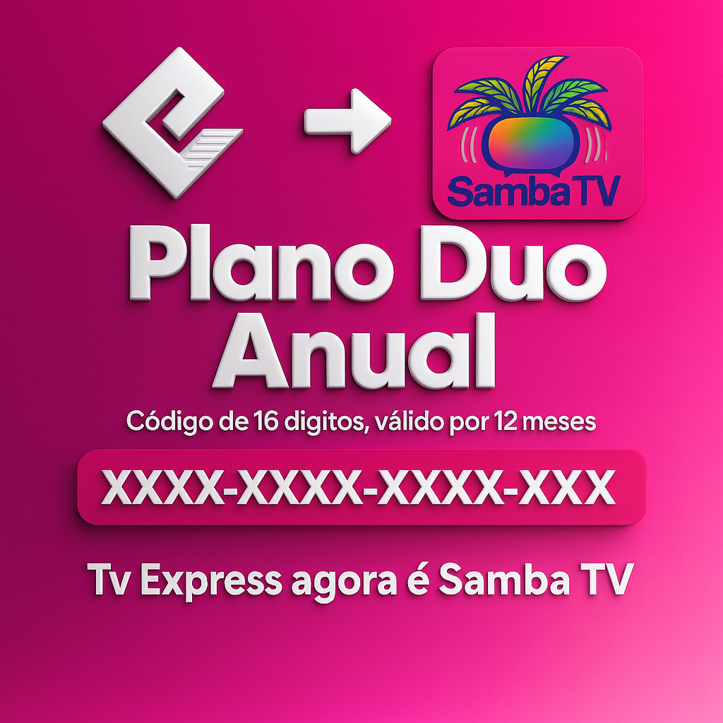 O Plano Duo Anual Samba TV (Antigo TV Express) é ideal para quem valoriza praticidade e quer compartilhar o melhor da programação em alta definição. É uma maneira simples e eficiente de unir economia e qualidade, com suporte disponível sempre que você precisar.